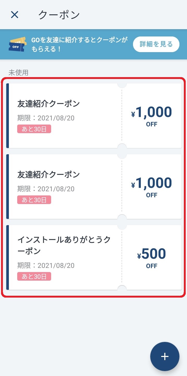 これで完了です。紹介特典のクーポンが付与されていることを確認してください。