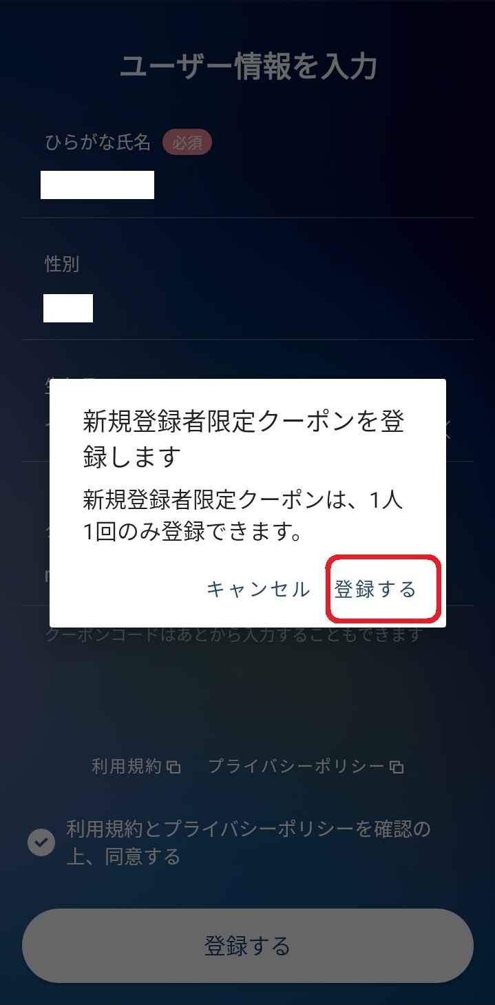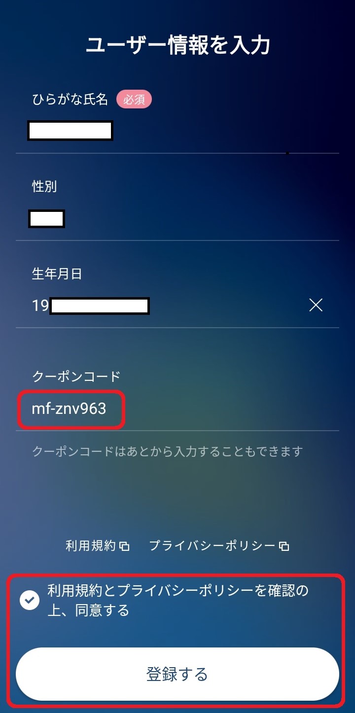 D氏名等、クーポンコード「mf-fg44rv」を入力し、同意欄にチェックして、「登録する」をタップ