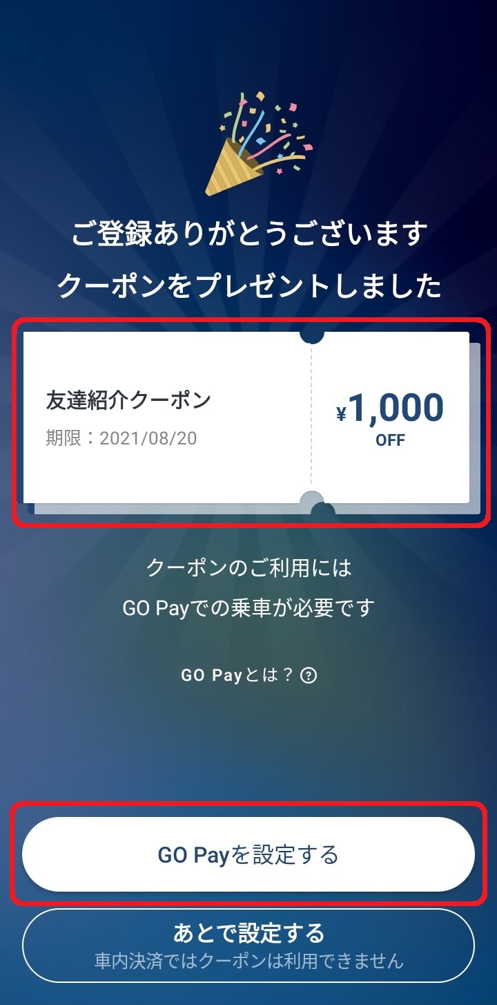 F登録が完了して、クーポンが付与されます。続いて、「GO Payを設定する」をタップ