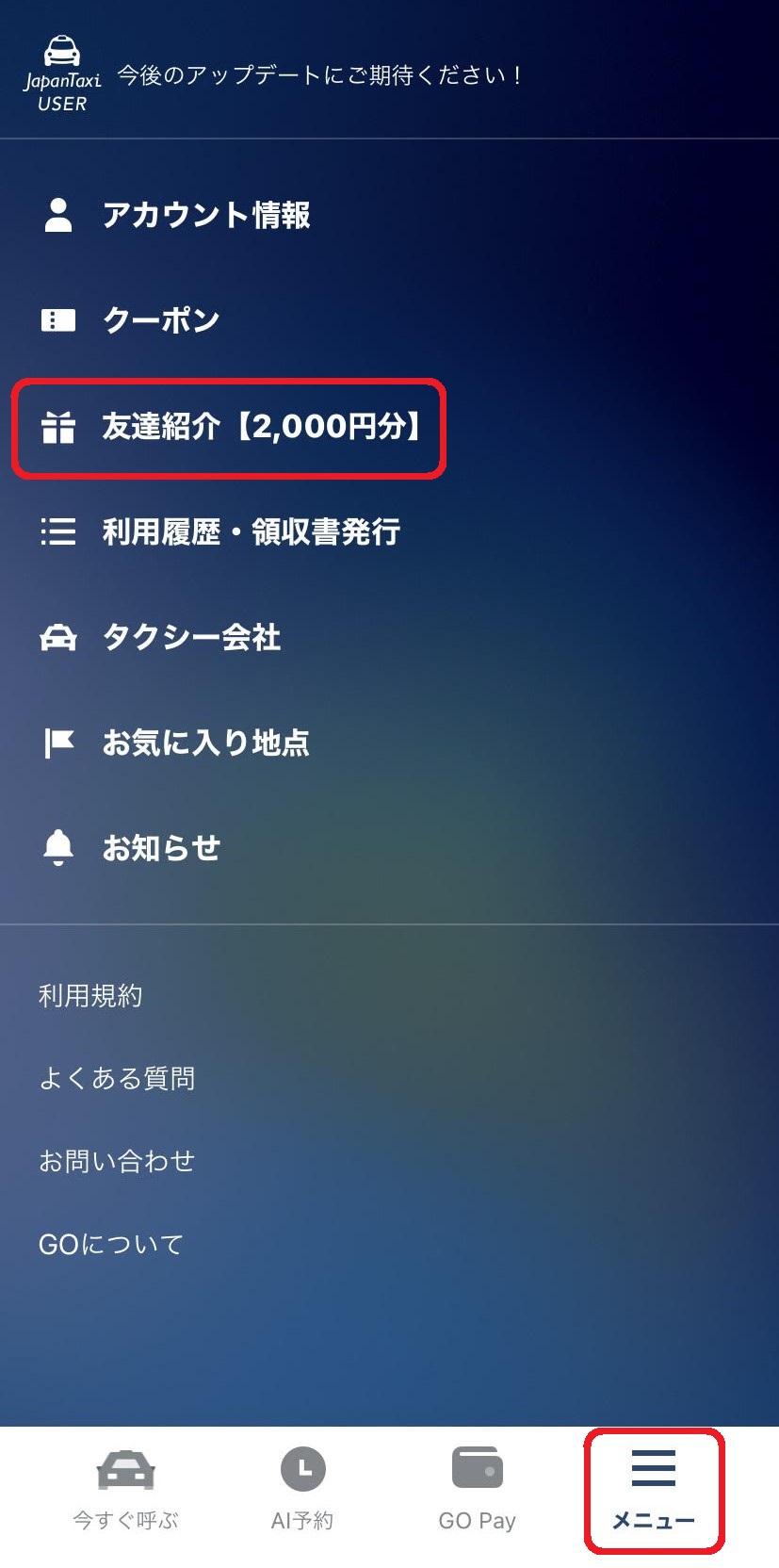 @アプリのメニューボタンをタップし、「友達紹介【2,000円分】」をタップ