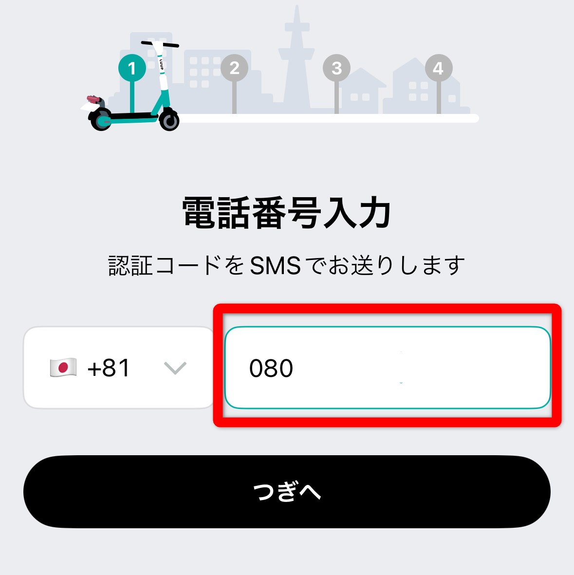 A電話番号を入力し、「つぎへ」をタップ