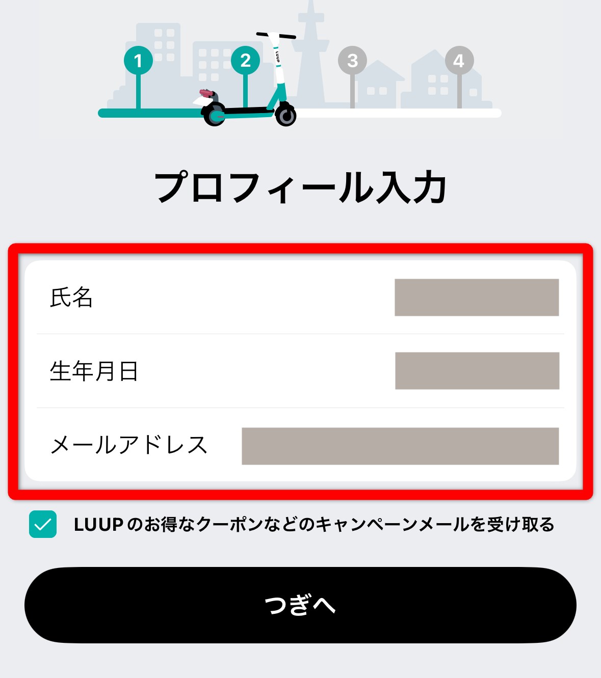 C氏名、生年月日、メールアドレスを入力し、「つぎへ」をタップ