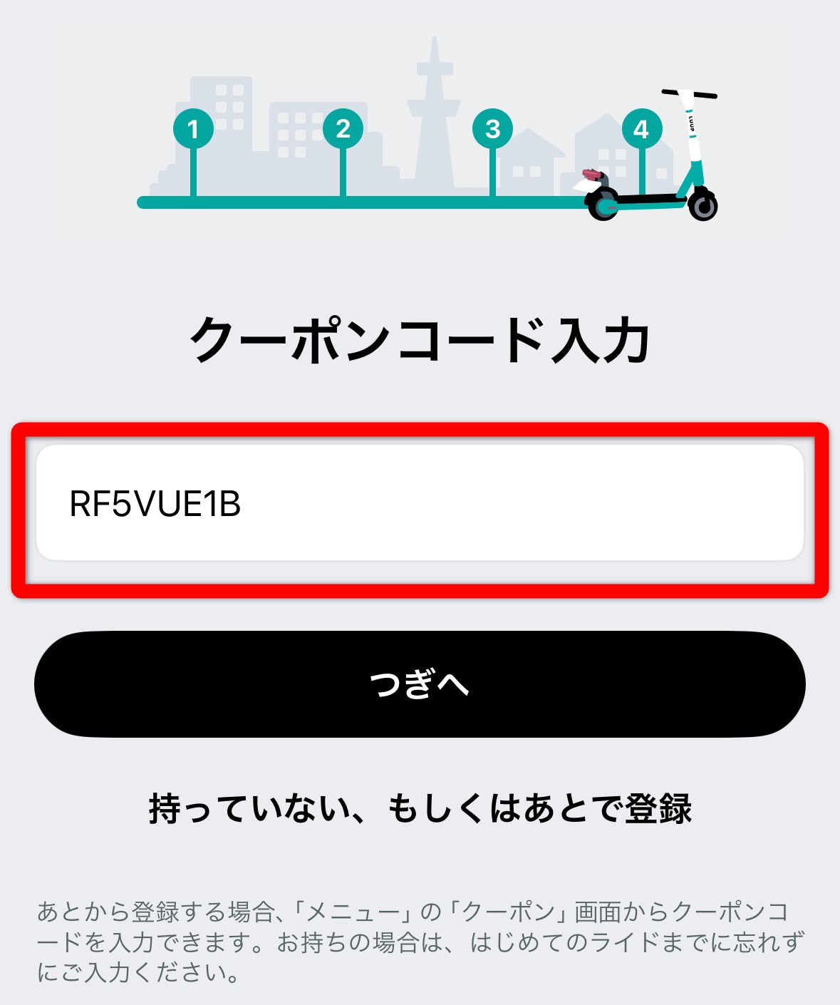 Eクーポンコード「RF5VUE1B」を入力し、「つぎへ」をタップ