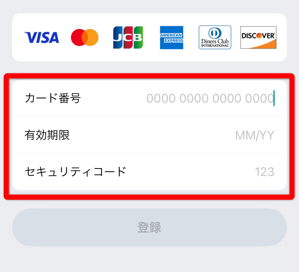 Dクレジットカードの情報を入力し、「登録」をタップ