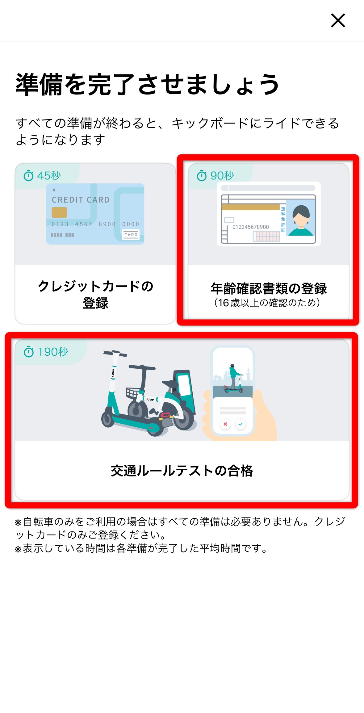 Gまでの登録で自転車は利用できますが、キックボードは年齢確認と交通ルールテストを実施する必要があります。