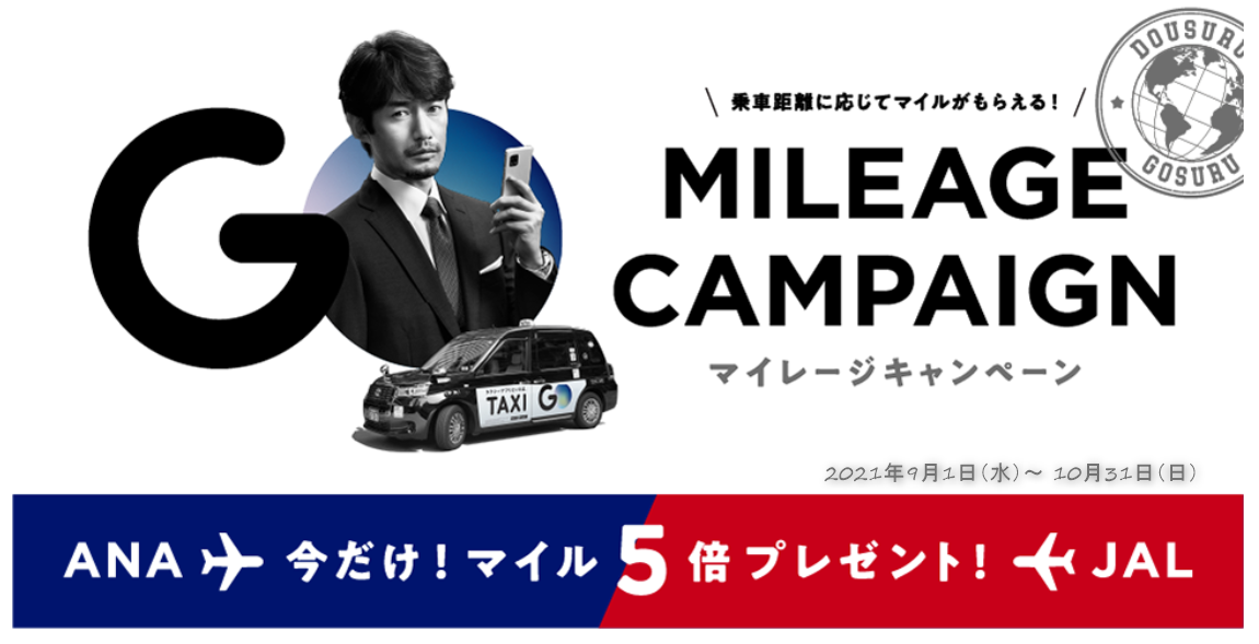 このキャンペーンは、ANAもしくはJALのマイレージ登録をすることで、キャンペーン期間中に「GO」アプリで乗車すると、1mile(乗車料金640円)毎に5マイルを獲得できるというものです!