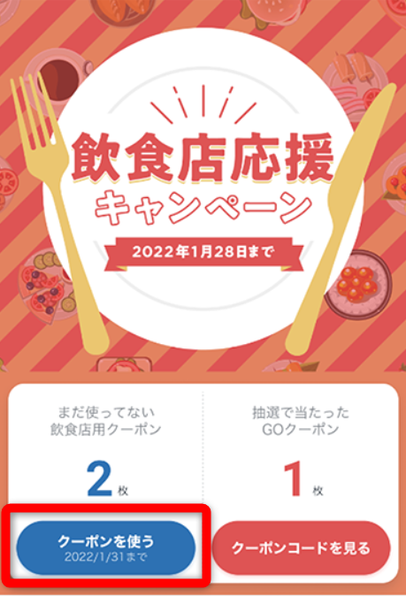 2021年11月22日〜 2022年1月28日の期間で、「お得なクーポンもらえる!飲食店応援キャンペーン」が実施されています。