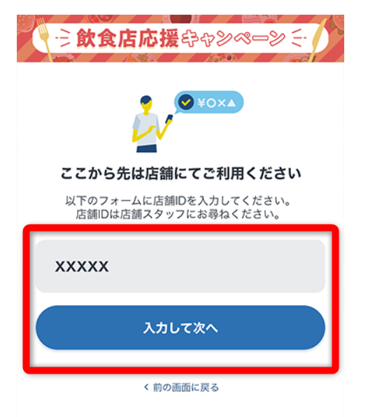 B会計時に店舗スタッフへ店舗IDを確認し、店舗IDを入力し、「入力して次へ」をタップ