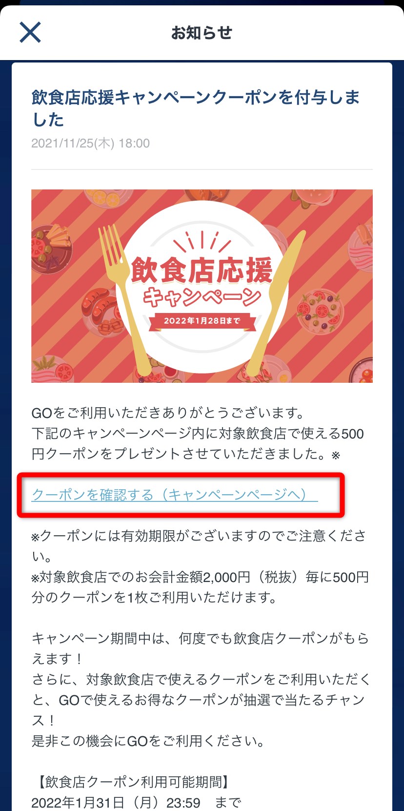 GOタクシーでお得なクーポンもらえる!飲食店応援キャンペーン【2022.1.28まで】